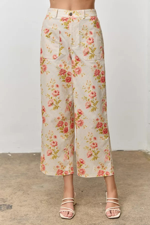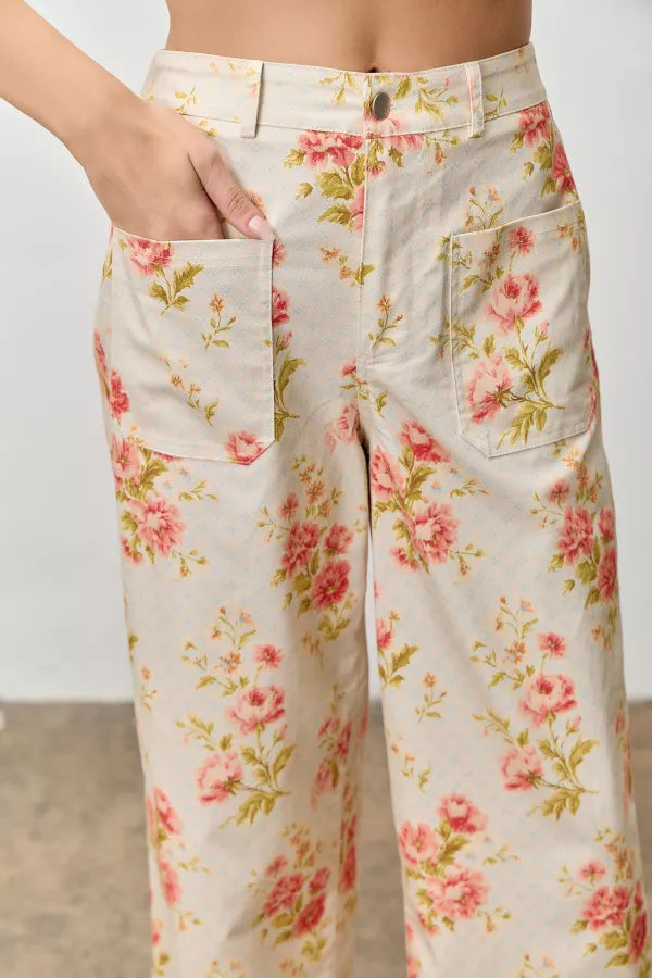 Embrace the season in these charming high-rise pants that blend vintage romance with modern comfort. The delicate floral print brings botanical elegance to your wardrobe, while the relaxed wide-leg cut flatters every frame. Subtle stretch fabric moves with you, and practical front pockets keep essentials close. An elastic back waistband ensures all-day ease without sacrificing that polished, put-together look. Perfect for leisurely brunches, garden strolls, or whenever you want to feel effortlessly chic.