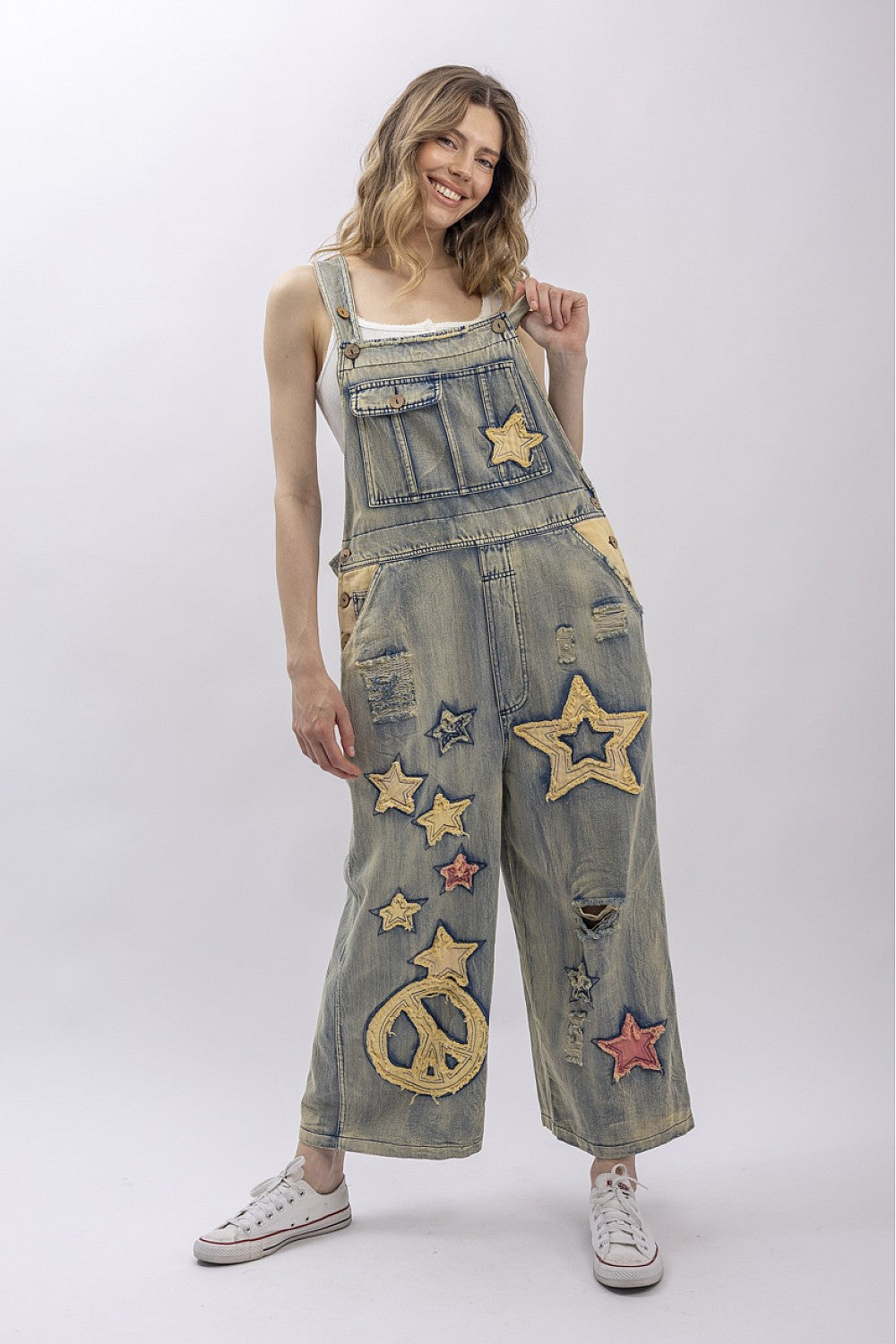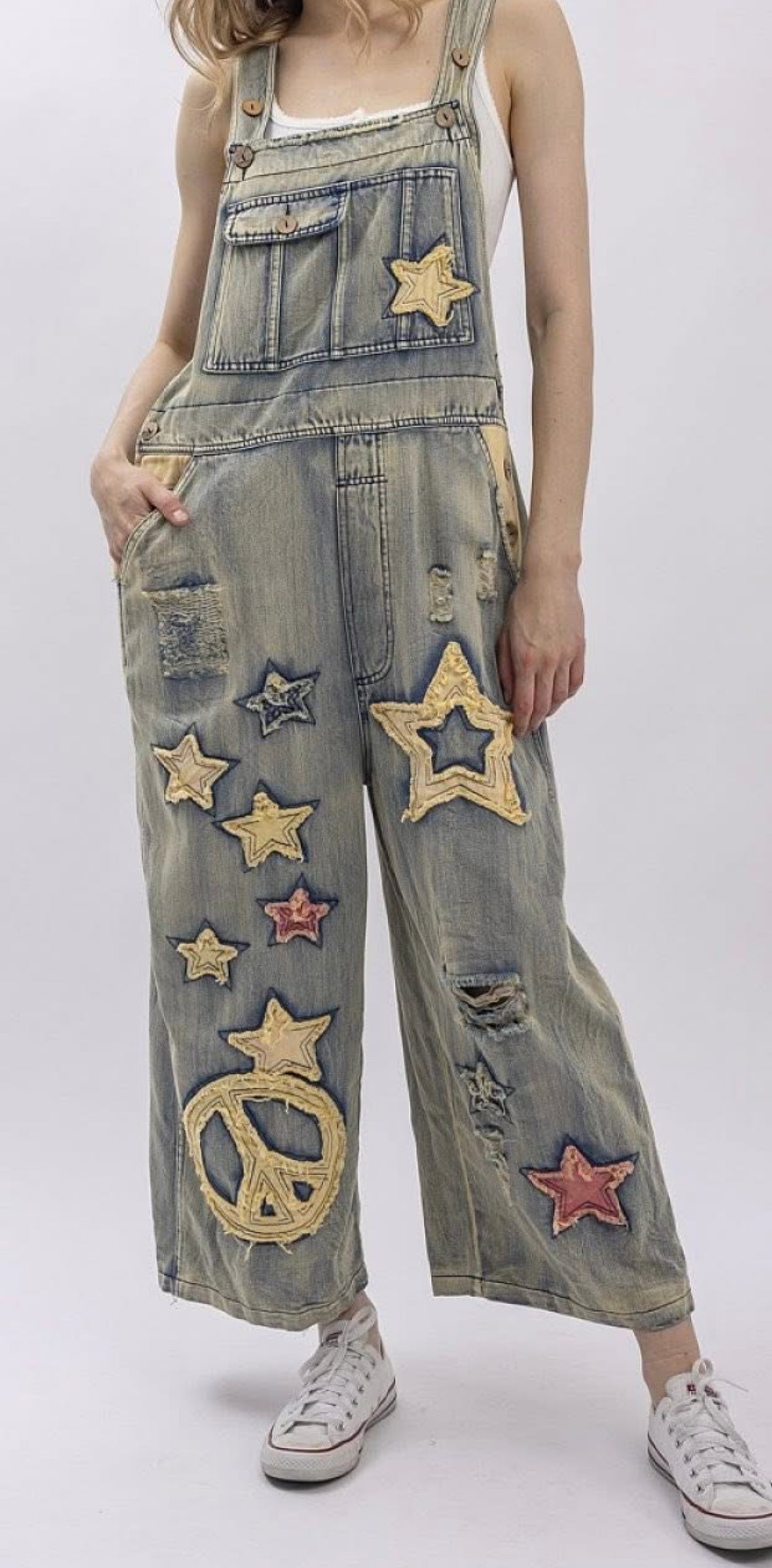 Embrace effortless style with these Star Patchwork Overalls, designed for comfort and personality. Featuring an oversized fit that moves with you, full-length coverage, and adjustable button straps at the shoulders and sides for a custom fit. The front bib pocket keeps essentials within reach, while the garment-washed fabric gives them that perfectly lived-in feel. Whether you're running errands or making a statement, these overalls deliver laid-back charm with a playful twist.