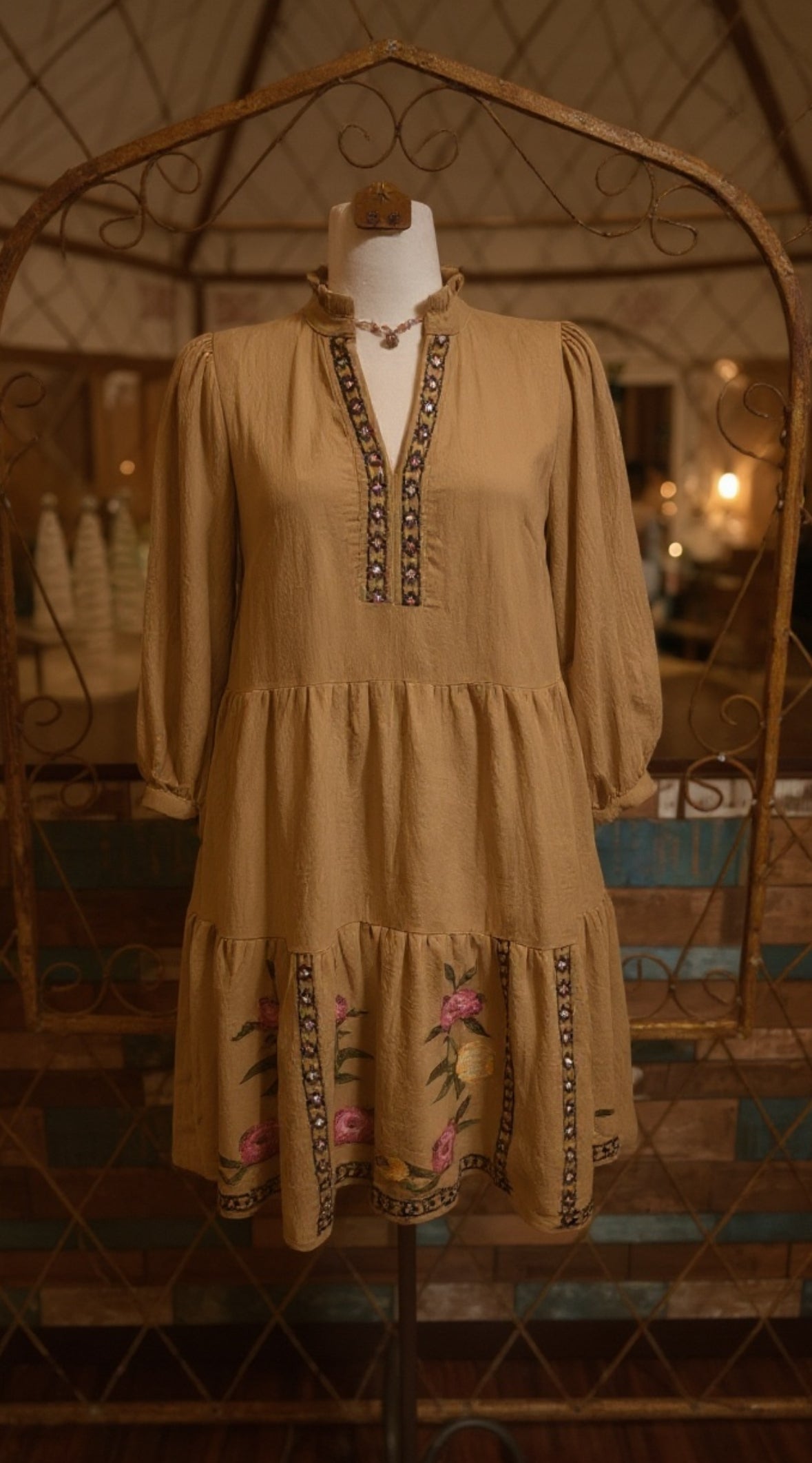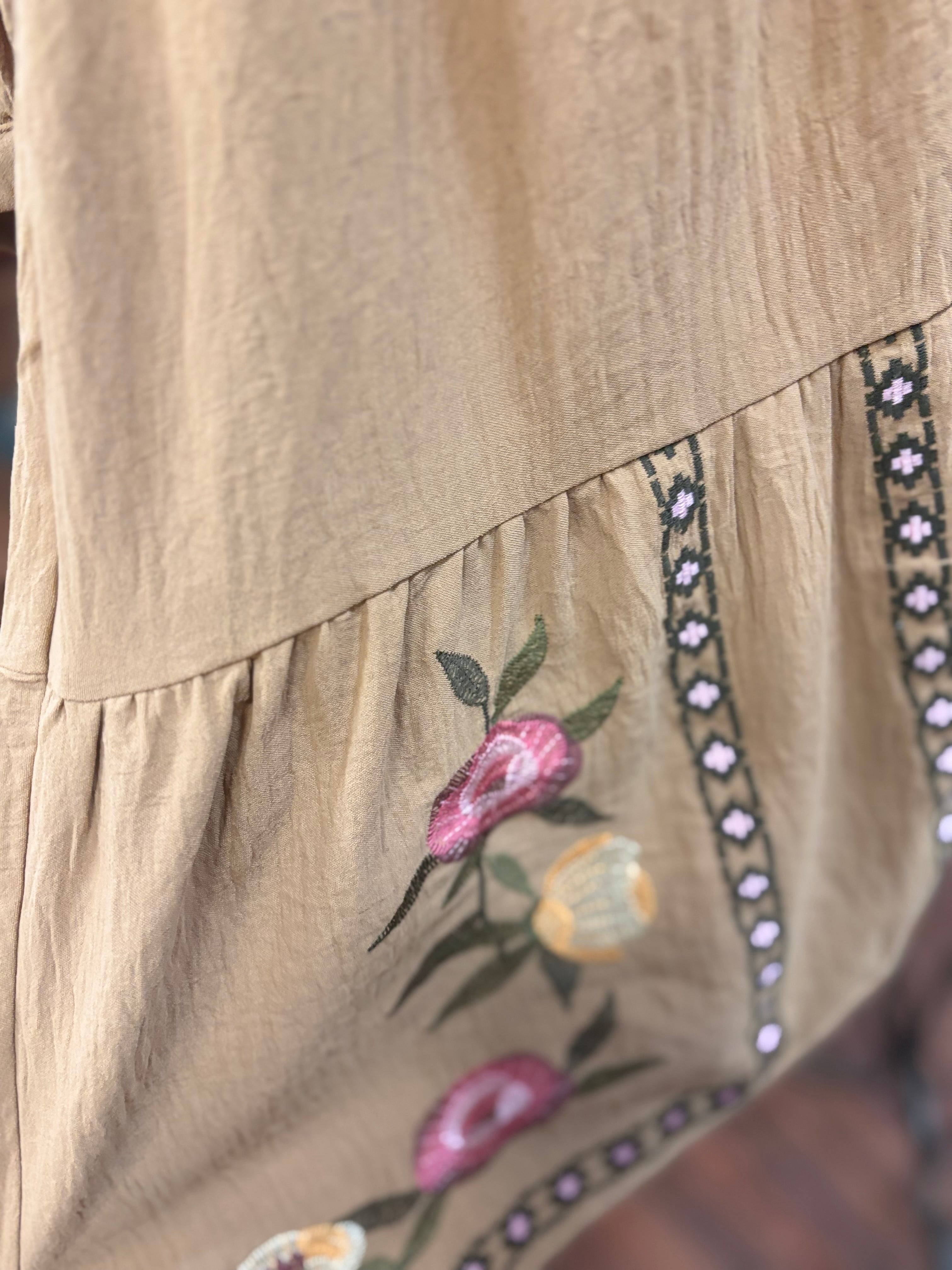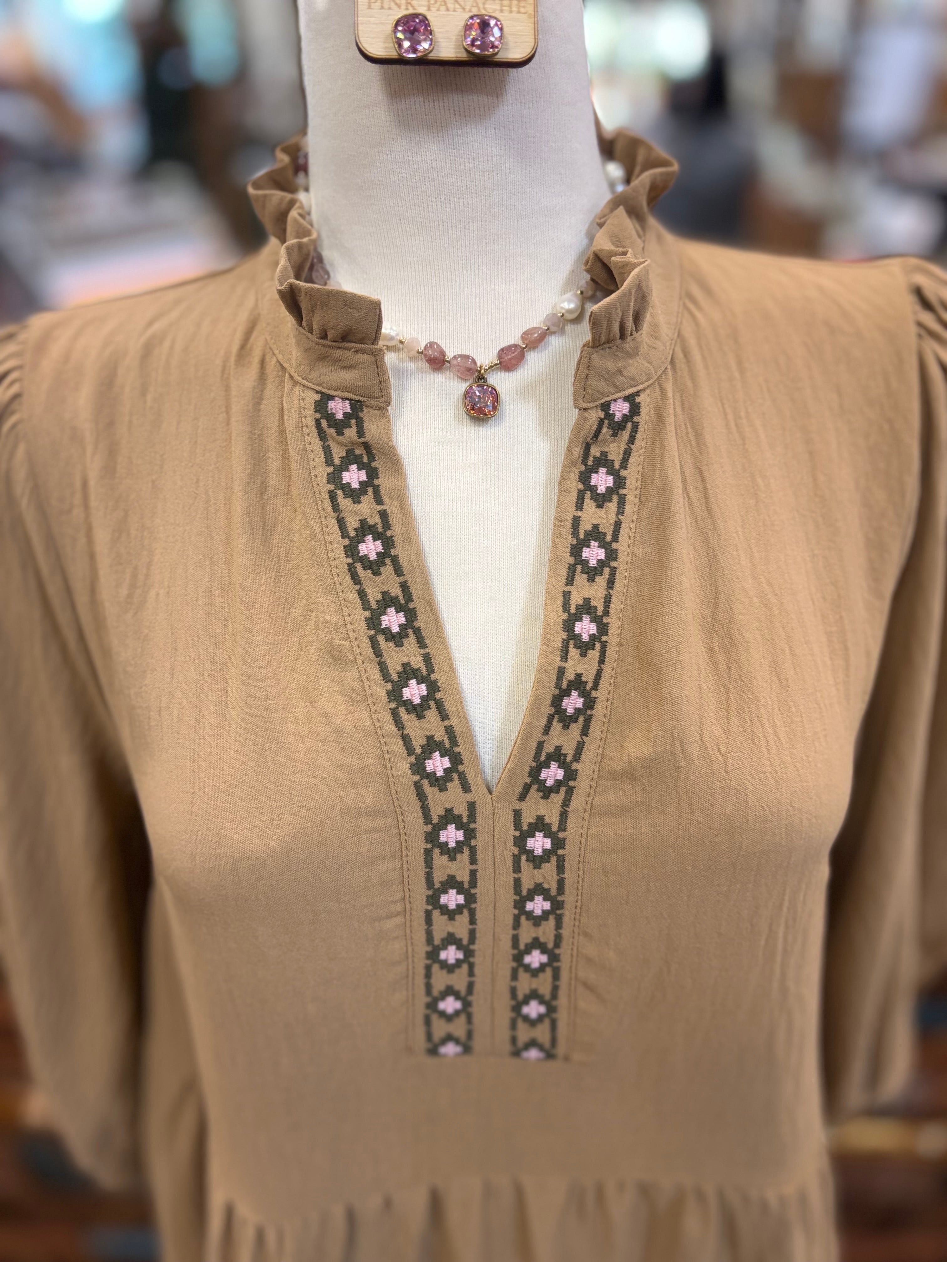 Slip into effortless style with this mocha beauty featuring a flattering ruffle neckline and charming 3/4 puff sleeves. The solid airflow fabric keeps you cool and comfortable all day long, while contrast embroidered hem panels add a touch of whimsy and personality. Perfect for casual outings or dressed-up occasions, this versatile dress brings together comfort and character in one delightful package.