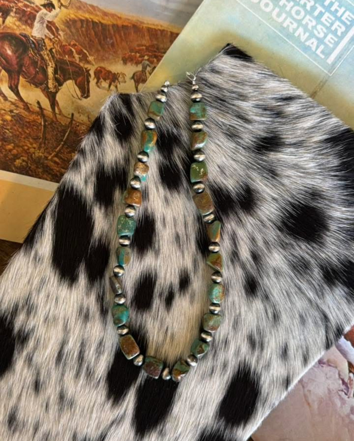 Elevate your style with this playful 18" Green Turquoise Necklace, featuring lustrous 8mm sterling pearls intertwined with vibrant, multi-colored turquoise chunks. Perfect for adding a pop of color and a splash of fun to any outfit.