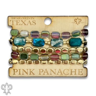 This bracelet set has five strands of faceted and smooth glass beads with gold beads mixed in, all in different sizes and shapes. You can stretch it on for the perfect fit. Faceted, smooth and gold tone beads * One size fits most