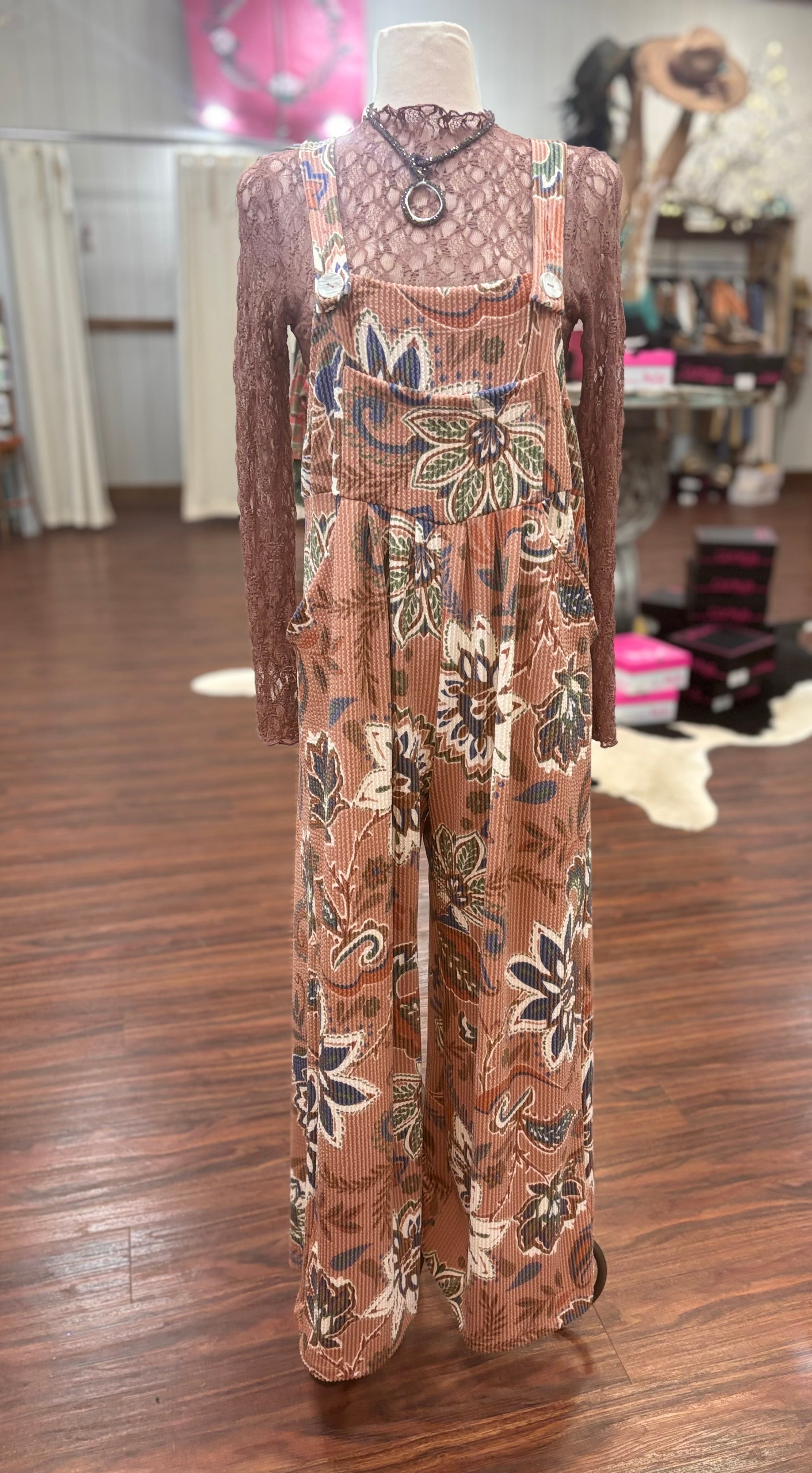 These Karli Overalls bring effortless style with a charming floral print on a warm taupe background. Crafted from premium ribbed fabric that's thick and opaque, these overalls feature practical pockets and an adjustable button strap—just fasten up or down to customize your length. The front pocket adds that perfect finishing touch. Slip them on for all-day comfort that doesn't compromise on looks.