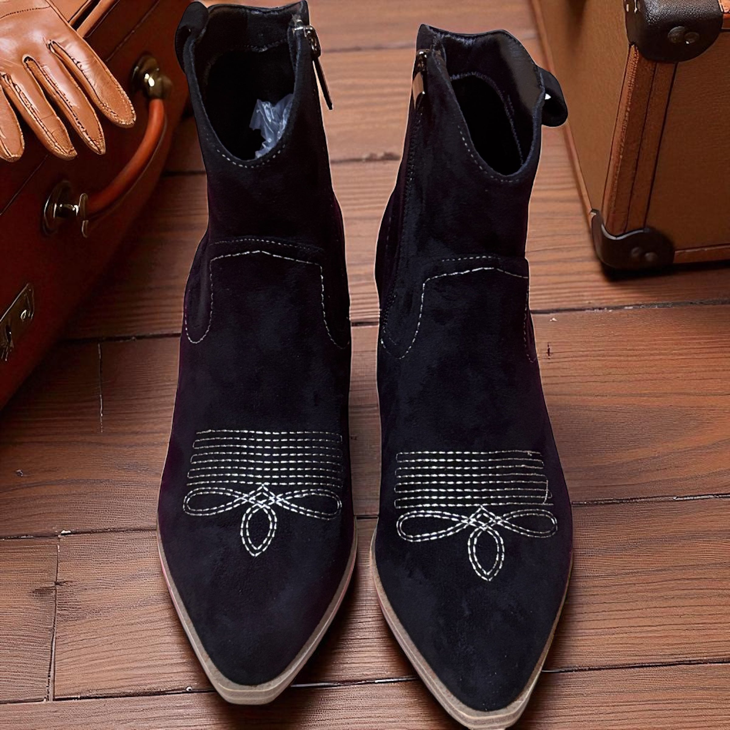 Step into style and comfort with the Quitten Time Bootie from Corky's. Featuring a playful 2.5" heel and a soft sueded upper, these booties offer an easygoing vibe with a side zip for quick wear. The charming boot stitch embroidery detail adds a unique touch that makes every step a statement. Perfect for adding a little fun flair to your everyday look!