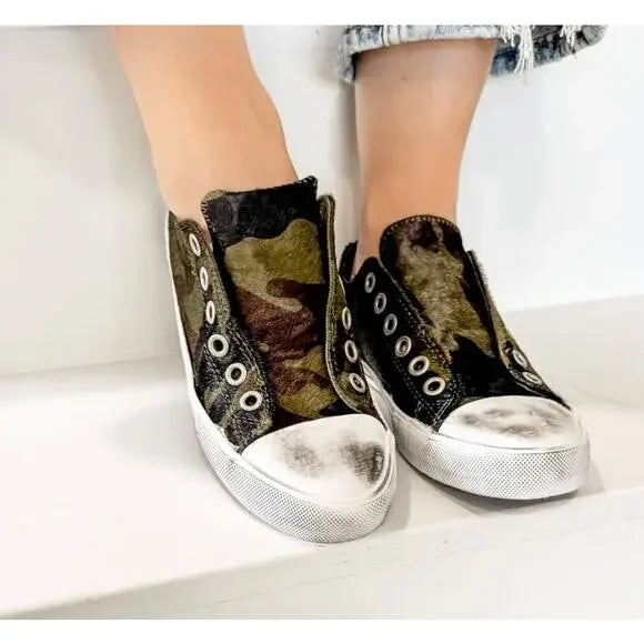 Step into style with the Naughty Monkey Shalomar Camo Sneaker, crafted from 100% genuine pony hair leather in an eye-catching camo pattern. The elastic-flanked tongue adapts to your foot shape for a personalized fit every time you wear them. Distressed white accenting adds an edgy, worn-in aesthetic that sets these sneakers apart. Perfect for those who want bold design with comfort that moves with you.