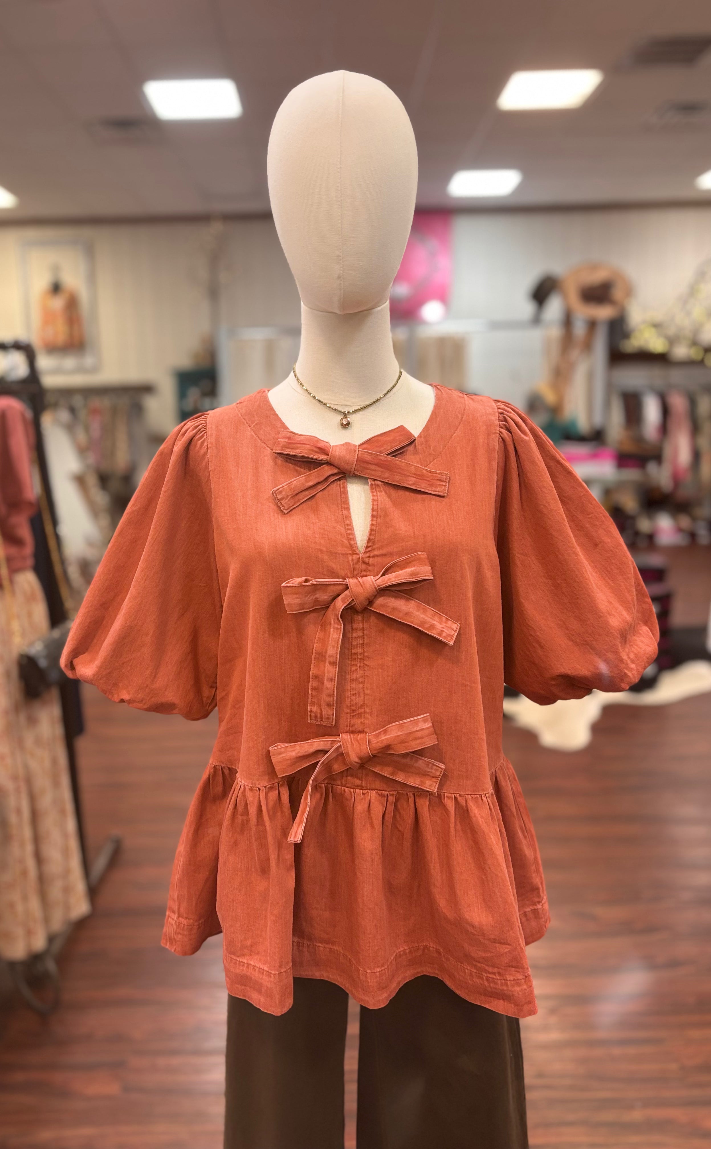Chai Latte Peplum Top brings vintage-inspired charm with its adorable bow front design and puffed short sleeves featuring gathered detailing. Three front tie bows add an interactive, flirty element you can adjust to your style. The slight V-neckline flatters while the relaxed fit keeps things comfy and effortless. A ruffled peplum hemline adds playful movement and dimension. Perfect for anyone who loves a little extra personality in their wardrobe.