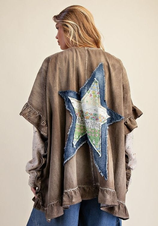 Embrace effortless style with the Mocha Star Duster, featuring a relaxed, oversized fit that flows beautifully with every move. Its open front and dropped shoulders create a breezy, comfortable look, while playful ruffled trims add a touch of charm. The standout is the large star patch on the back—perfect for those who love to shine in subtle, stylish ways. Whether layered or worn alone, this chambray duster brings fun and flair to any outfit.