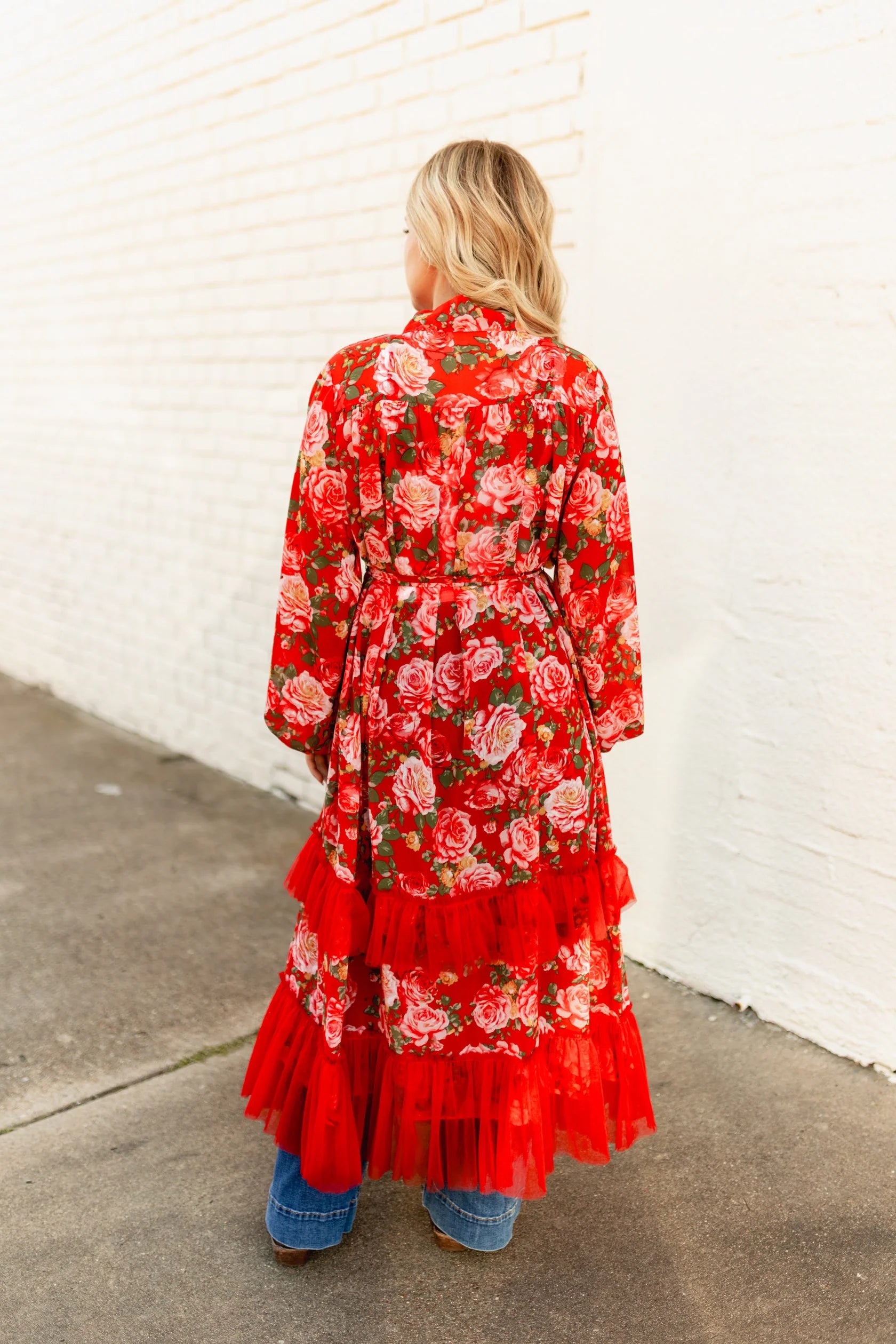 Make a statement with this stunning red rose kimono that's as fun to wear as it is fabulous to look at. The vibrant red base bursts with an allover pink rose floral print, while layered red tulle ruffles dance along the hem for extra flair. Designed with a relaxed open front, long sleeves, and a gorgeously flowy silhouette, it's the perfect piece for layering over your favorite denim, dresses, or basics. Lightweight and unlined, this beauty gives you softness without the weight—because who says bold visual impact can't feel amazing? Style it your way and let your personality shine through.