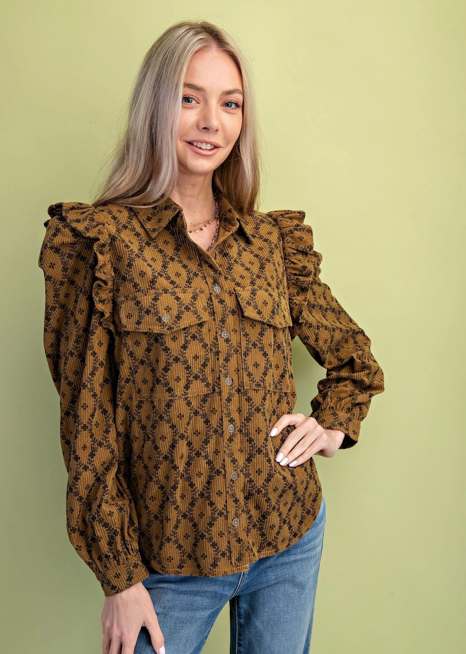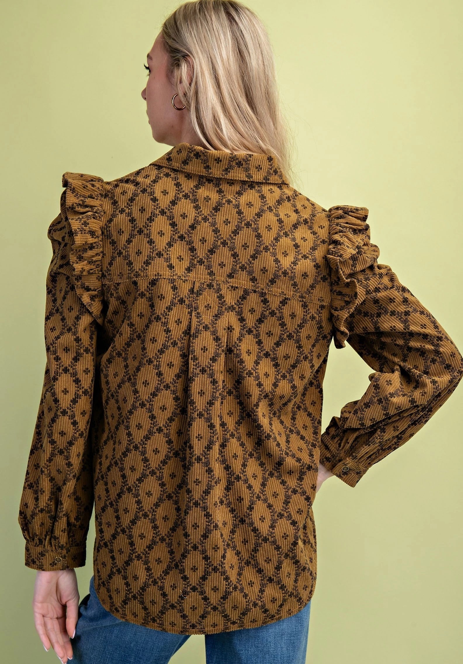 This playful ruffled corduroy shirt in a warm mustard mix is perfect for adding a touch of fun to your fall wardrobe. Its floral print and ruffled shoulders bring charm, while the cozy corduroy fabric keeps you comfy. Wear it as a lightweight jacket or a standout shirt to brighten up crisp autumn days.
