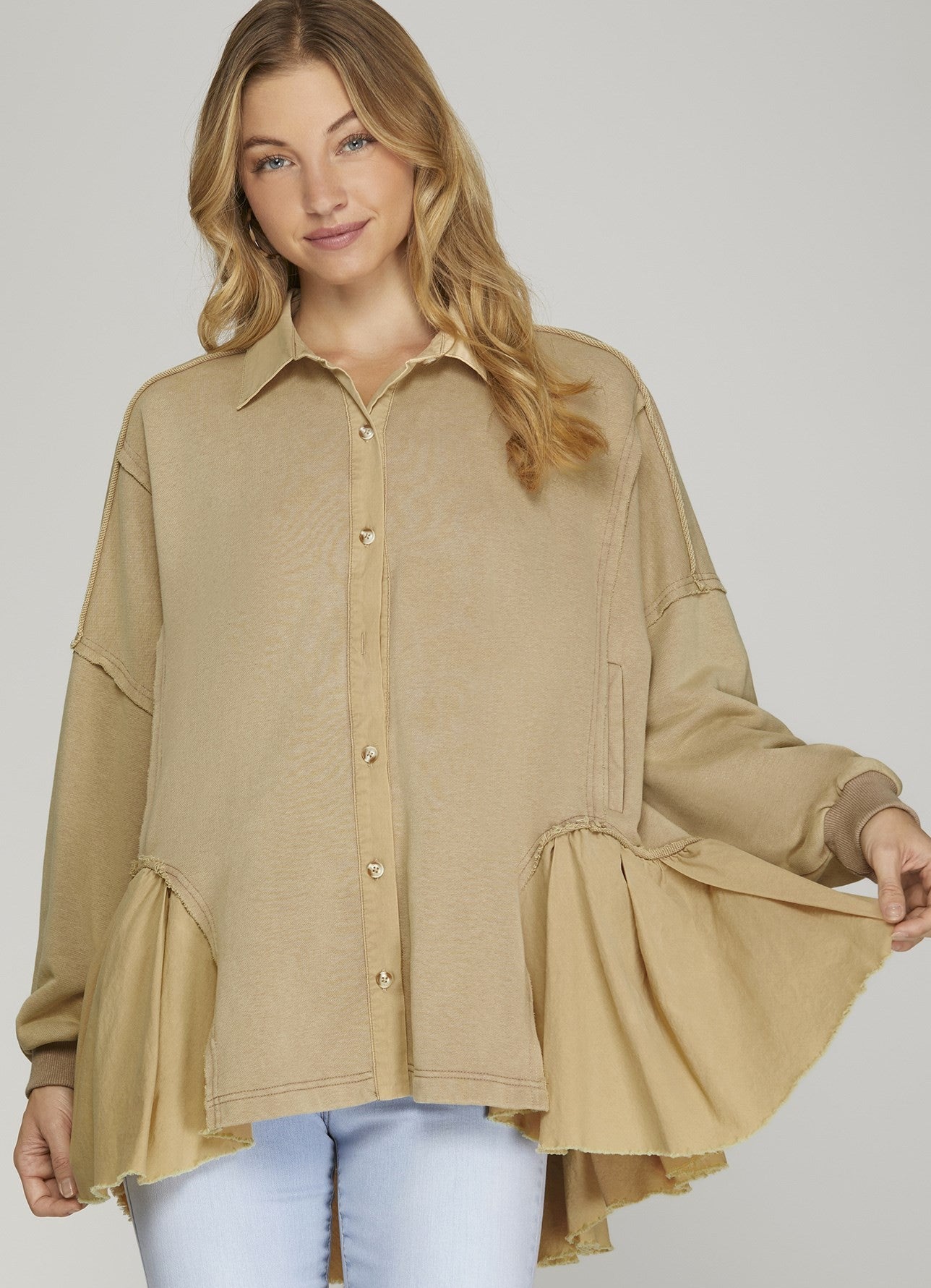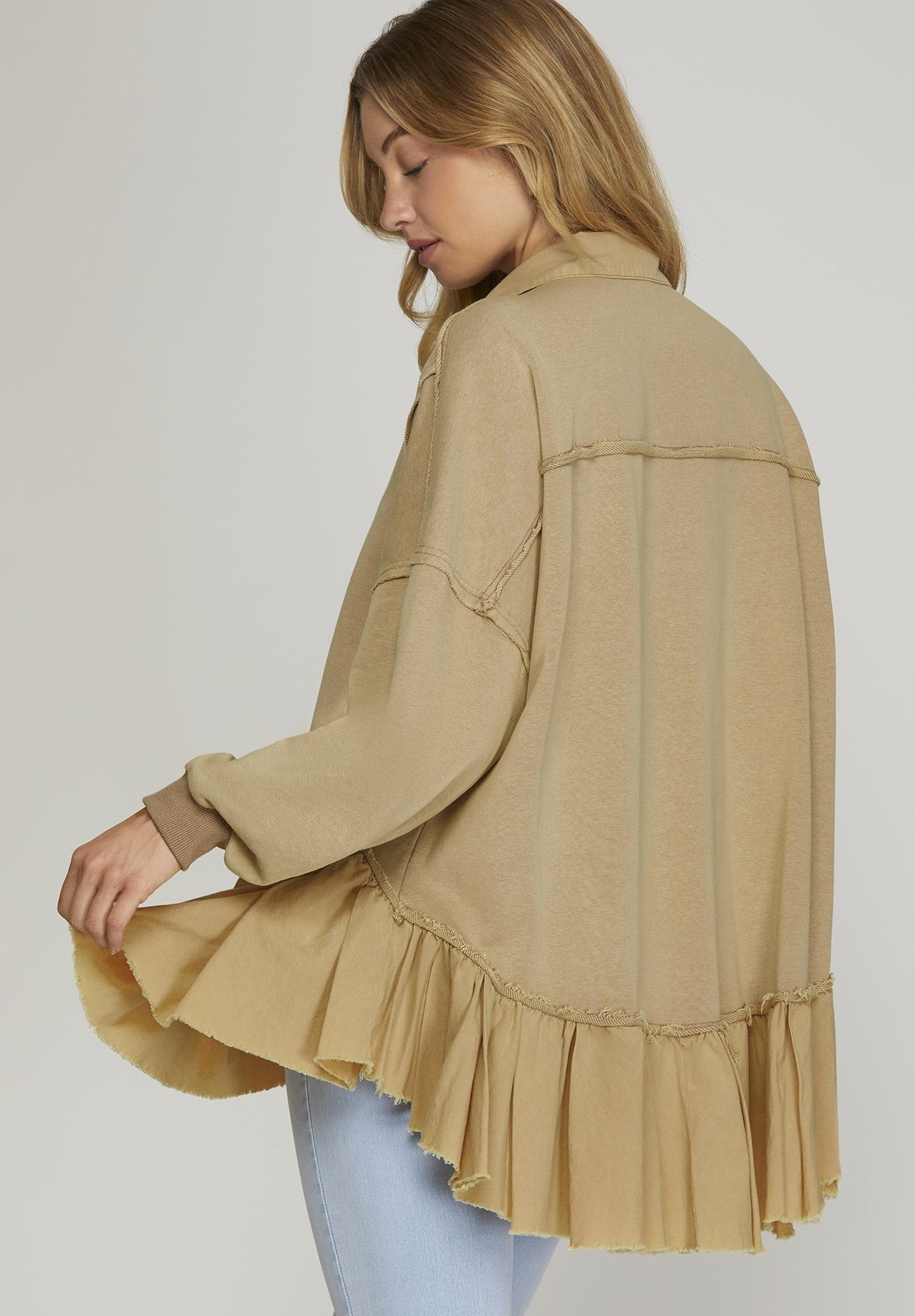 Layer up with effortless cool in this oversized shacket that blurs the line between shirt and jacket. Crafted in soft taupe with a relaxed, loose fit, it features charming contrast ruffles along the hem and functional pockets for all your essentials. The button-up front and long sleeves make it endlessly versatile—throw it over anything for instant edge and attitude. Perfect for those who refuse to play it safe.