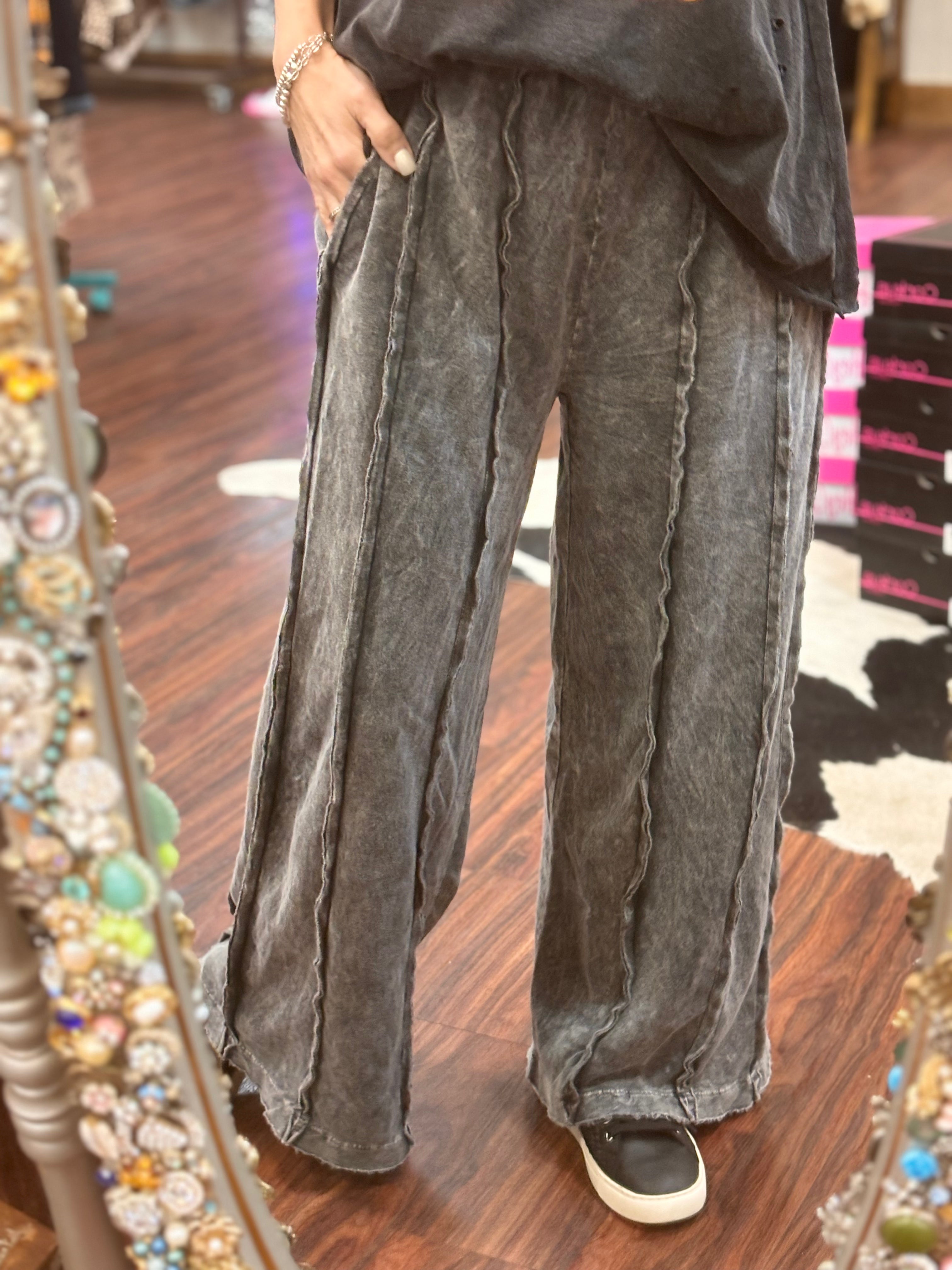 These Ashed Black Pants bring laid-back cool with their mineral-washed finish for that effortlessly lived-in vibe. Raw outseams add a cheeky edge, while wide, loose legs keep things comfy and breezy—perfect for lounging or making a statement without trying too hard.