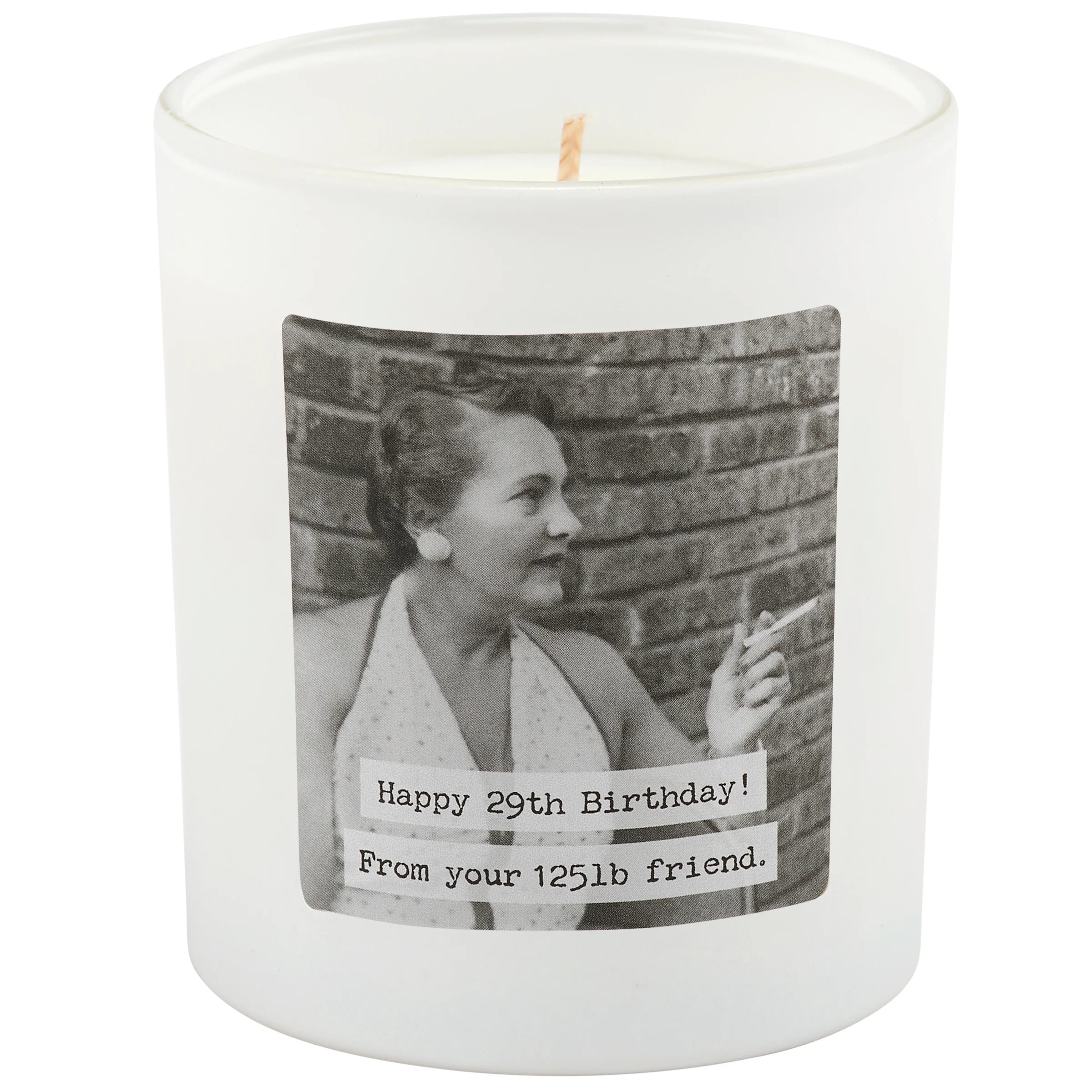 Celebrate another year with a laugh! This frosted white glass jar candle from our Trash Talk By Annie Collection features a cheeky double-sided vintage photograph and the hilarious message "Happy 29th Birthday! From Your 125lb Friend." Crafted with eco-friendly soy-based wax and a clean-burning cotton wick, it delivers 35 hours of delightful Birthday Cake scent to any room. Complete with a protective dust cover and plastic lid, this witty candle makes the perfect gag gift for birthdays, office desks, or anyone who appreciates humor with their home fragrance.
