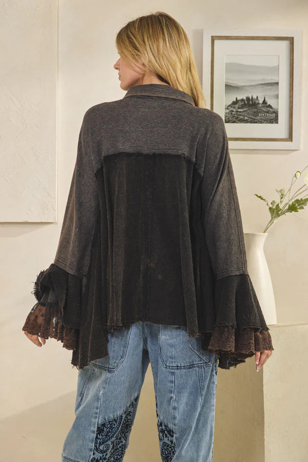 Meet your new wardrobe MVP—the Landslide Top works as hard as you do. This black button-down rocks a relaxed, oversized fit with flowy sleeves adorned in lace trim, while the mineral wash gives it that coveted worn-in charm. Layer it, button it up, or throw it on as a jacket—this versatile piece bends to your style. One top, endless possibilities.